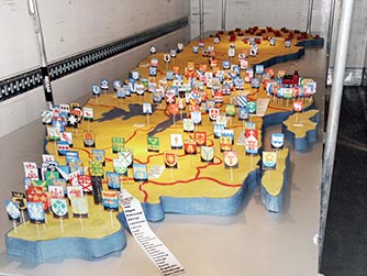 Alla kommuner som var med fick sitt kommunvapen på tårtan och även namn. Rosorna symboliserar kommunerna som inte ville vara med.